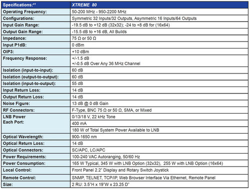 The XTREME 80 next generation L-band matrix switch features 80 ports in a compact 2 RU chassis. The XTREME 80 is a full fan-out (distributive), non-blocking switch where an input can be routed to any or all outputs. The XTREME 80 features an industry exclusive flexible matrix architecture (patent pending) that supports both symmetric and asymmetric configurations of 80 combined inputs and outputs in a single chassis. Asymmetric configurations such as 16x64, 8x56, and more can be implemented as well as the standard 32x32 configuration. It is designed for maximum reliability with redundant power and control cards.