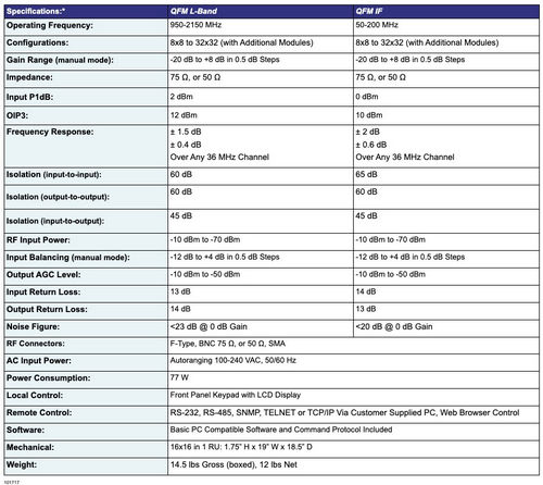 The QRM is a full fan-out RF matrix switch that can be fully populated as a 16x16. Available in 1 RU as 8x8, 8x16, 16x8 and 16x16. The 8x8 can be expandable to full 16x16 with purchase of access code. The QRM can be easily expanded to a maximum system size of 32x32 by adding additional modules. The QRM features Quintech’s latest Q-ROUTE™ and Q-SENSE™ technology, which provides maximum reliability with signal path redundancy and auto re-route capabilities. The QRM’s operating frequency range covers L-band, IF and Broadband. It also offers manual and AGC modes. It is controllable either locally via the front panel keypad or remotely over Ethernet and is compatible with most monitoring and control systems