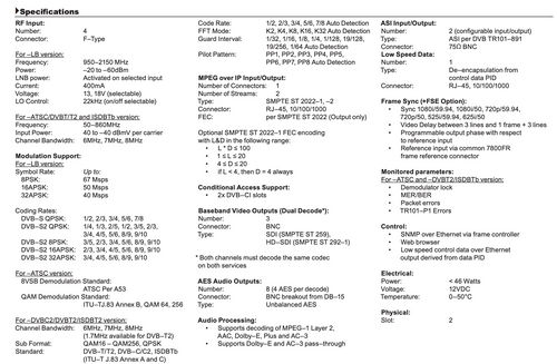 Applications include signal reception for broadcasters, cable, DTH and IPTV providers, or any other small to large head-end operators who need to receive and utilize or re-distribute satellite content, and also receive and distribute off-air local contents.