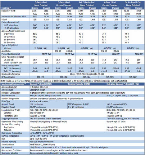 A large center hub provides spacious accommodation for equipment mounting. The reflector is supported by a galvanized elevation over azimuth kingpost pedestal that provides the required stiffness for pointing and tracking accuracy. The pedestals are designed for full orbital arc coverage and are readily adaptable to ground or rooftop installations. The electrical performance is compliant with FCC and ITU-RS-580 sidelobe specifications and Intelsat (B, C) and Eutelsat requirements.