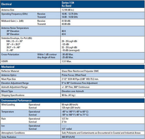 The General Dynamics 1134 series antenna is ideally suited for demanding commercial and industrial VSAT applications. The one-piece compression molded reflector is precision manufactured for high-efficiency Ku-Band operation. The Az/El mount is designed for easy installation and features fine azimuth and elevation adjustments to dial in and optimize your satellite signal. The Az/El mount is constructed from heavy gauge, pre-galvanized steel for strength and corrosion resistance. A standard Ku- Band linear cross pol Rx/Tx feed comes standard with the Series 1134 Antenna.