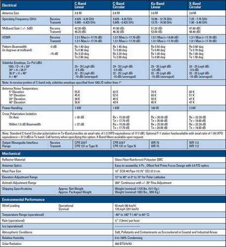 - Antenna Optics: Prime Focus, Offset Feed, Four-piece reflector