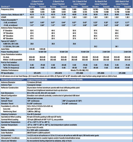 A large center hub provides spacious accommodation for equipment mounting. The reflector is supported by a galvanized elevation over azimuth kingpost pedestal that provides the required stiffness for pointing and tracking accuracy. The pedestals are designed for full orbital arc coverage and are readily adaptable to ground or rooftop installations. The electrical performance is compliant with FCC 25.209 regulations, ITU-RS-580 sidelobe specifications and Intelsat (F3) and Eutelsat requirements.