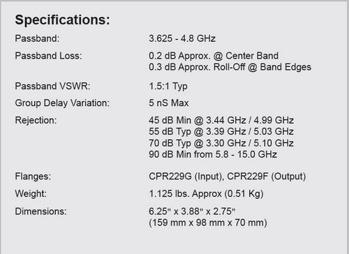 This filter protects the extended C-band of 3.625-4.8 GHz from potential interference originating below or above the band.