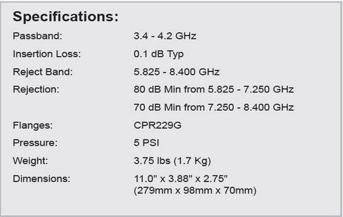 - Rejection: 80 dB Min from 5.825 - 7.250 GHz; 70 dB Min from 7.250 - 8.400 GHz