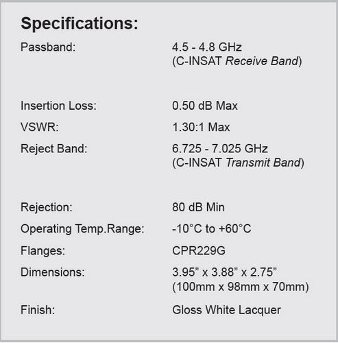 - Passband: 4.5 - 4.8 GHz (C-INSAT Receive Band)