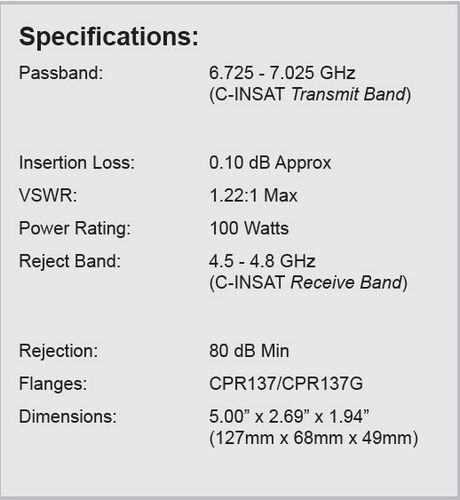 - Passband: 6.725 - 7.025 GHz (C-INSAT Transmit Band)