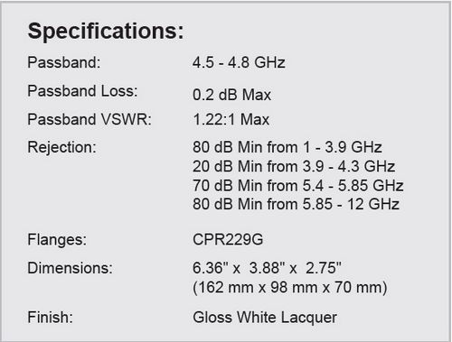 This versatile receive filter rejects the extended (INSAT) transmit band (6.725 - 7.025 GHz), and also rejects transmissions from other potential sources of interference.