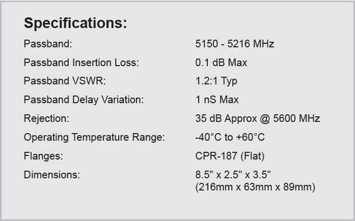 This bandpass filter is used for special C-band receive applications in the LEO (Low Earth Orbit) satellite band.