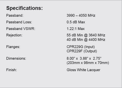 This bandpass filter protects this portion of the C-band from potential sources of interference operating above and below the band (i.e. – WiMAX, Radar, etc.)
