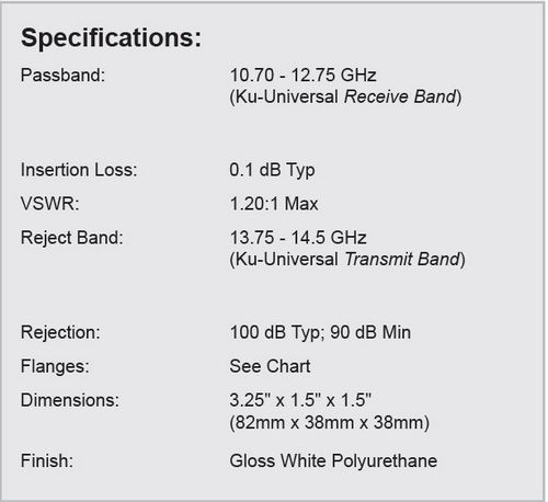 - Reject Band: 13.75 - 14.5 GHz (Ku-Universal Transmit Band)