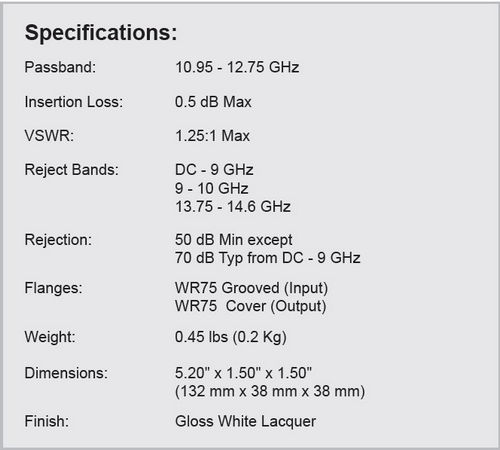 This multi-purpose Ku-band receive filter rejects interfering signals above (Ku-band Transmit) and below (Marine Radionavigation) the receive band.