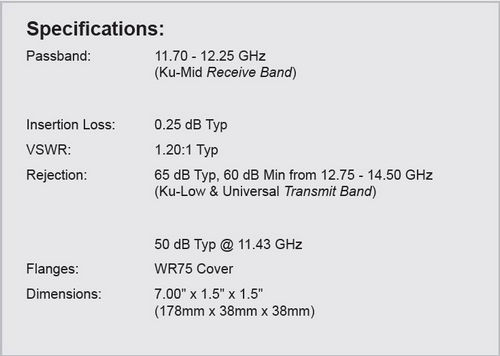 - Passband: 11.70 - 12.25 GHz (Ku-Mid Receive Band)