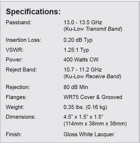 - Passband: 13.0 - 13.5 GHz (Ku-Low Transmit Band)
