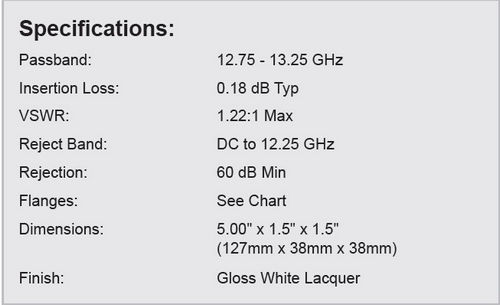 Used for Ku-(mid) band transmit applications, this filter rejects the receive band and virtually all other undesired signals operating below the transmit band.