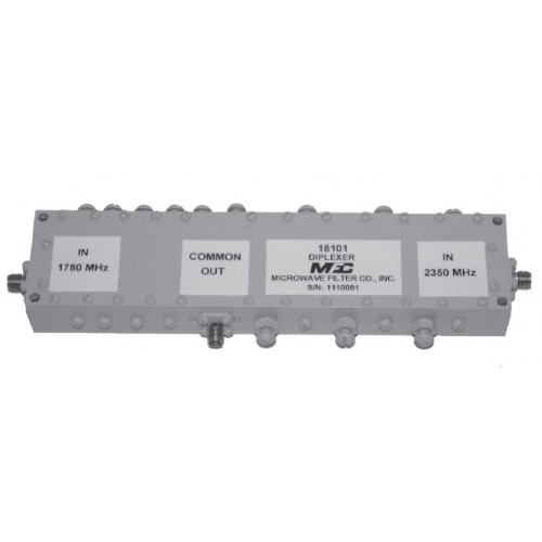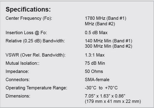 The model 18101 consists of a low band (1710 - 1850 MHz) bandpass filter section and a high band (2200 - 2500 MHz) bandpass filter section coupled together, resulting in superior isolation between the two bands.