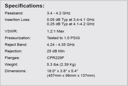 - Insertion Loss: 0.05 dB Typ at 3.4-4.1 GHz; 0.25 dB Typ at 4.1-4.2 GHz