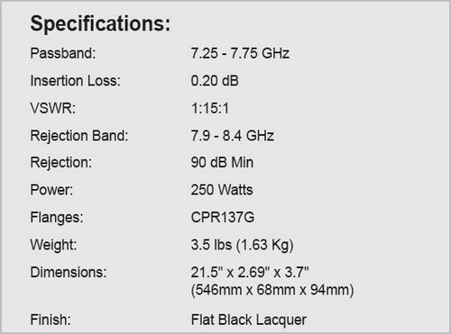 This downlink filter provides a CPR137 interface and offers extremely low loss, while exhibiting very high suppression of the uplink (transmit) band.
