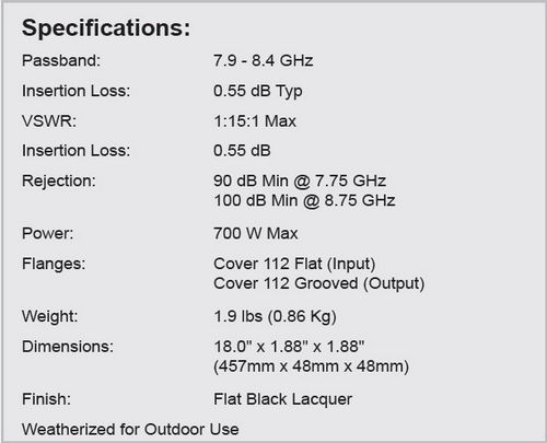 This versatile uplink filter not only isolates transmission from the (lower frequency) downlink band, it’s bandpass design also provides suppression above the transmit band to 10 GHz.