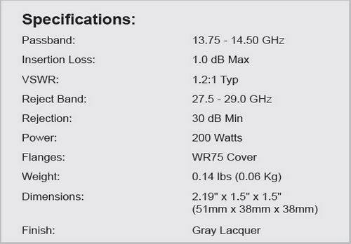 This compact transmit filter is designed to suppress the 2nd harmonic frequency range of the Ku-Band.