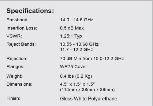 This uplink filter provides isolation from the downlink band of 11.7-12.2 GHz.