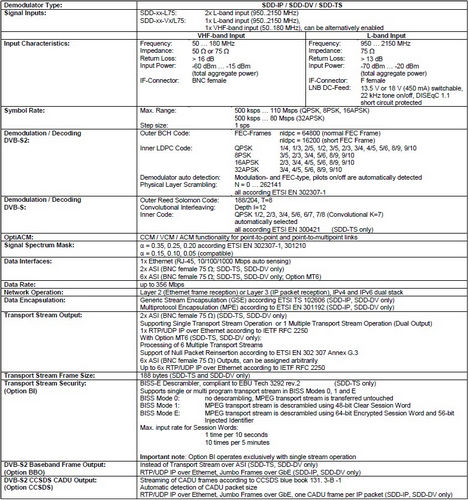 The SDD-IP demodulator provides operators with a platform for receiving IP/Ethernet data over DVB-S2 satellite connections. The device is the corresponding demodulator unit to the DVB-S2 IP modem SK-IP and supports low overhead Generic Stream Encapsulation and Multiprotocol Encapsulation. In combination with the integrated support of OptiACM and VideoACM, the demodulator provides adaptive or variable FEC and modulation setting for point-to-point or point-tomultipoint applications.
