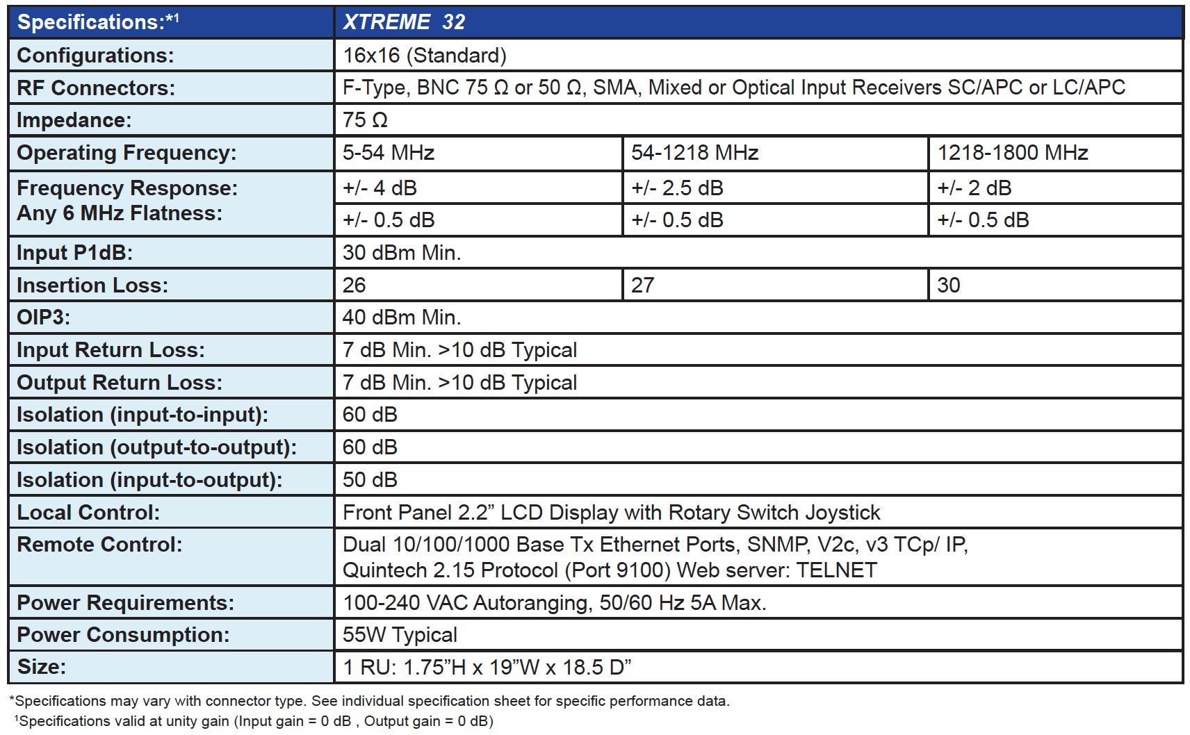 The XTREME 32 DOCSIS 3.1 compatible passive matrix switch is a bi-directional non-blocking signal management solution that routes an input to any or all outputs. The design features an industry exclusive architecture that supports both symmetric and asymmetric configurations of 32 combined inputs and outputs in a compact 1 RU chassis. Hot-Swappable redundant power supplies, I/O Modules, and a field replaceable cooling fan provide maximum reliability.